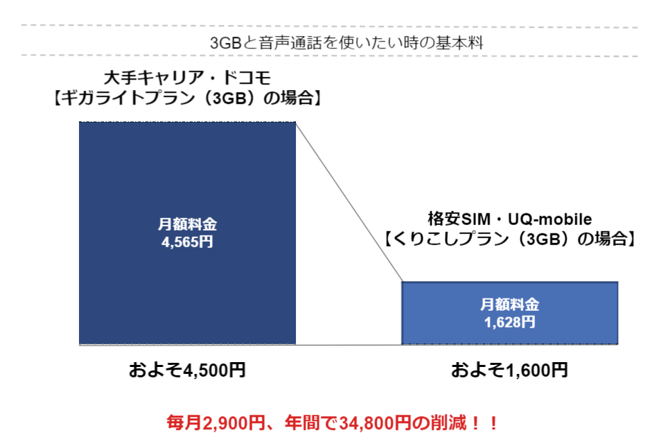 仮に最低利用期間中に格安SIMを解約した場合、同じく契約解除料をとられるものの、3,000~6,000円ほどで済みます。