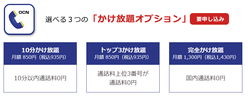 OCNモバイルONEには、以下の3つのかけ放題オプションがあります。
