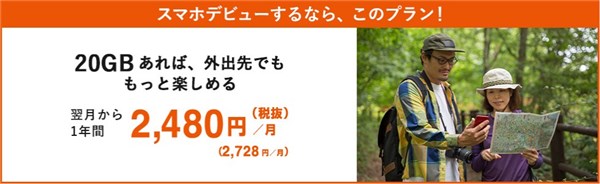 22歳以下なら利用でき、契約1年目は20GBを月額2,728円で利用できます。プランの種類は1種類しかないものの、ソフトバンクのスマホデビュープラン+のベーシックプランと同じ金額です。家族全体でauキャリアを使っている場合はお得に利用できるでしょう。