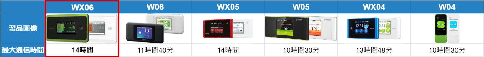 「WX06」の最大連続通信時間は14時間となっており、他の端末と比べて2~4時間長く使用することができます。