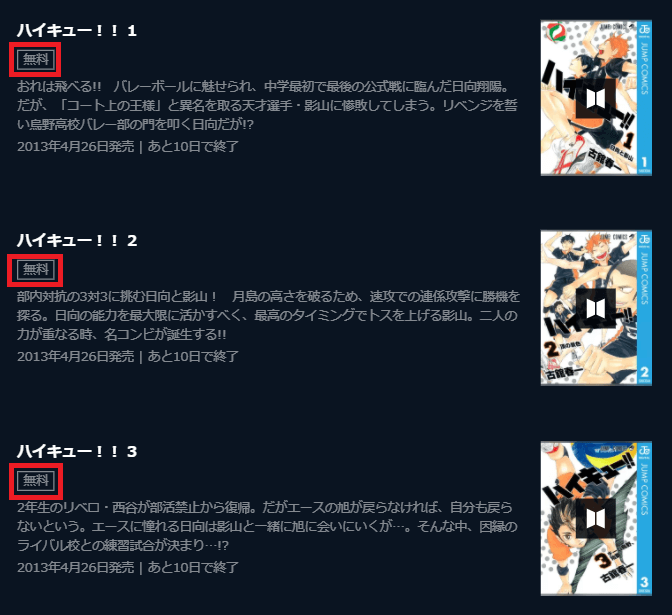 例えば、人気漫画『ハイキュー』は、1~3巻まで無料で読むことができます。