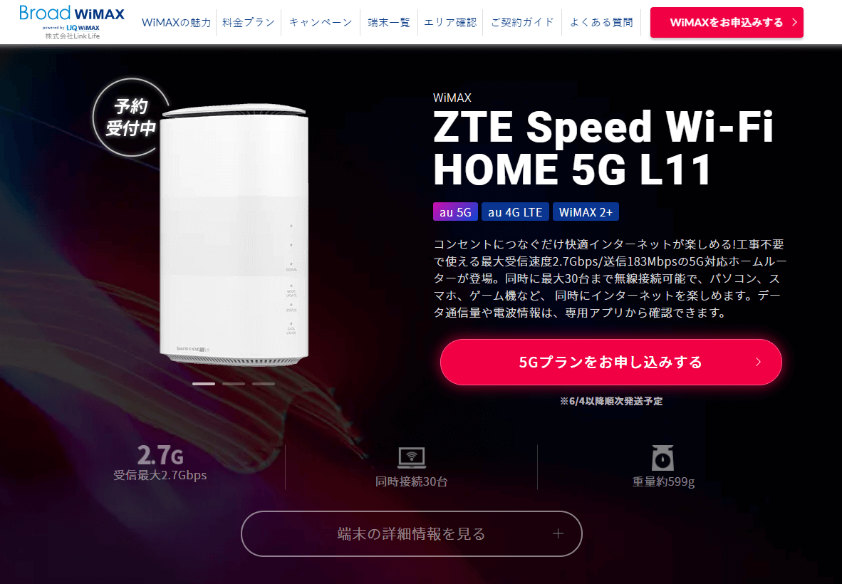 WiMAX(UQコミュニケーションズ)から、5G通信に対応したホームルーター「Speed Wi-Fi HOME 5G L11」が6月4日に発売されます。